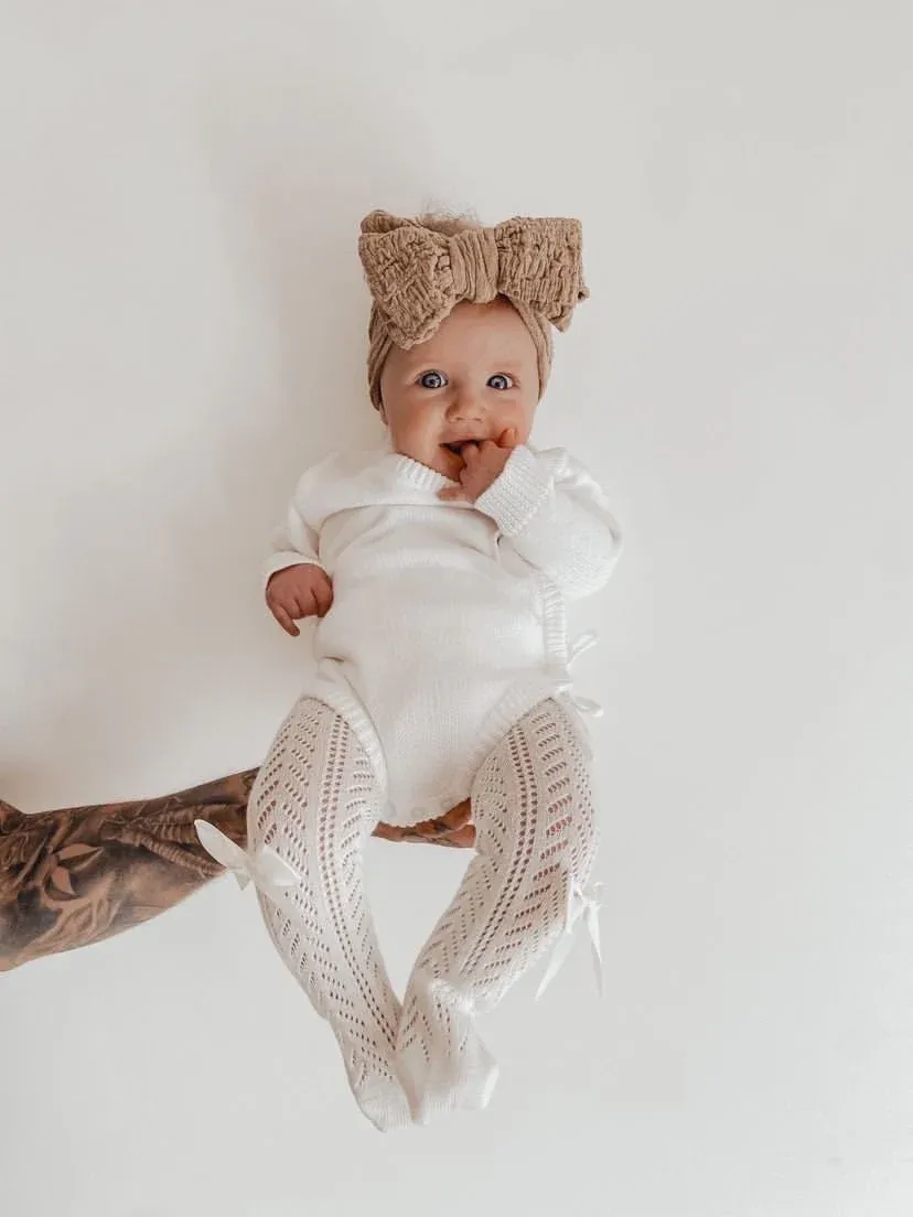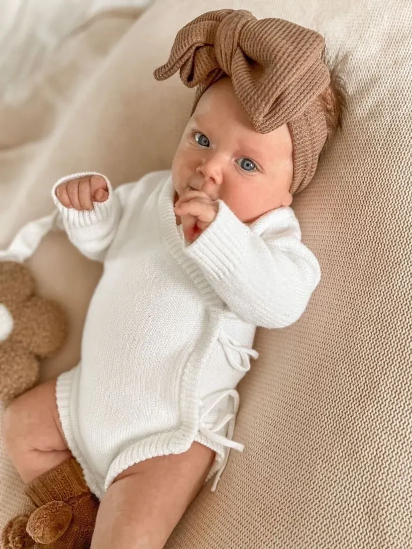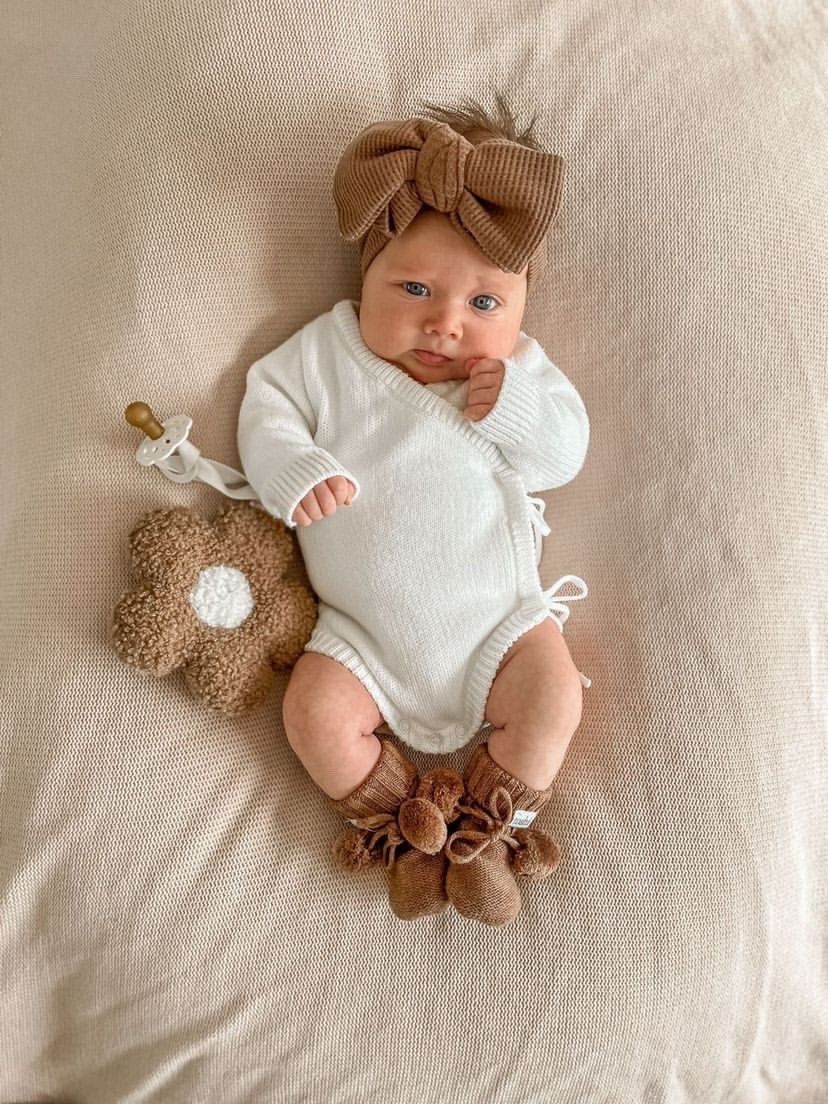 Our knit bodysuits are the perfect piece. This bodysuit is made from the softest 100% cotton. Two ties on the side and snap buttons make nappy changing easy.