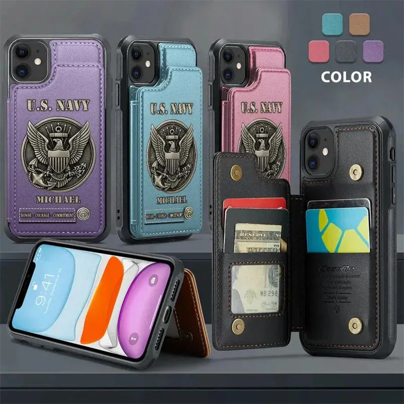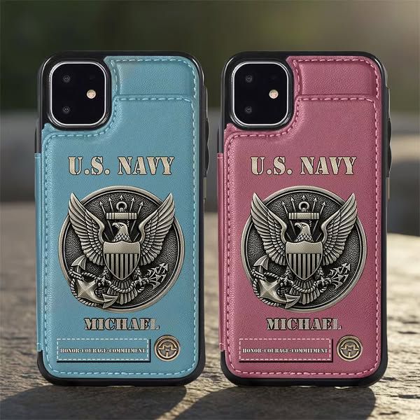 Personalized US Navy leather wallet-style phone case, a veteran's gift, a gift for dads and grandpas.