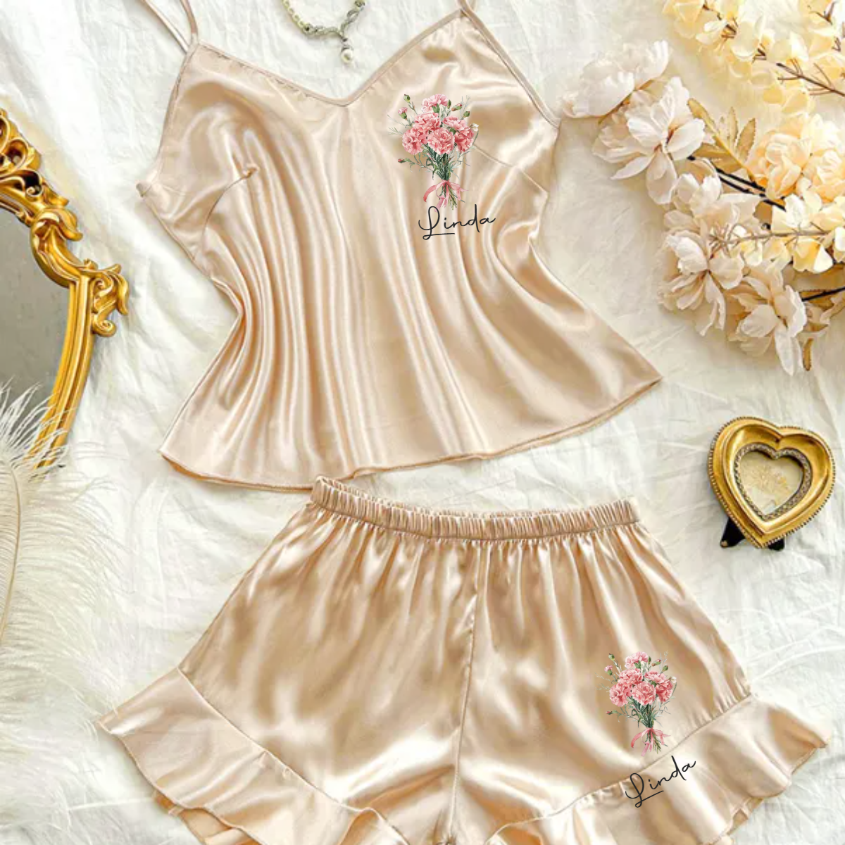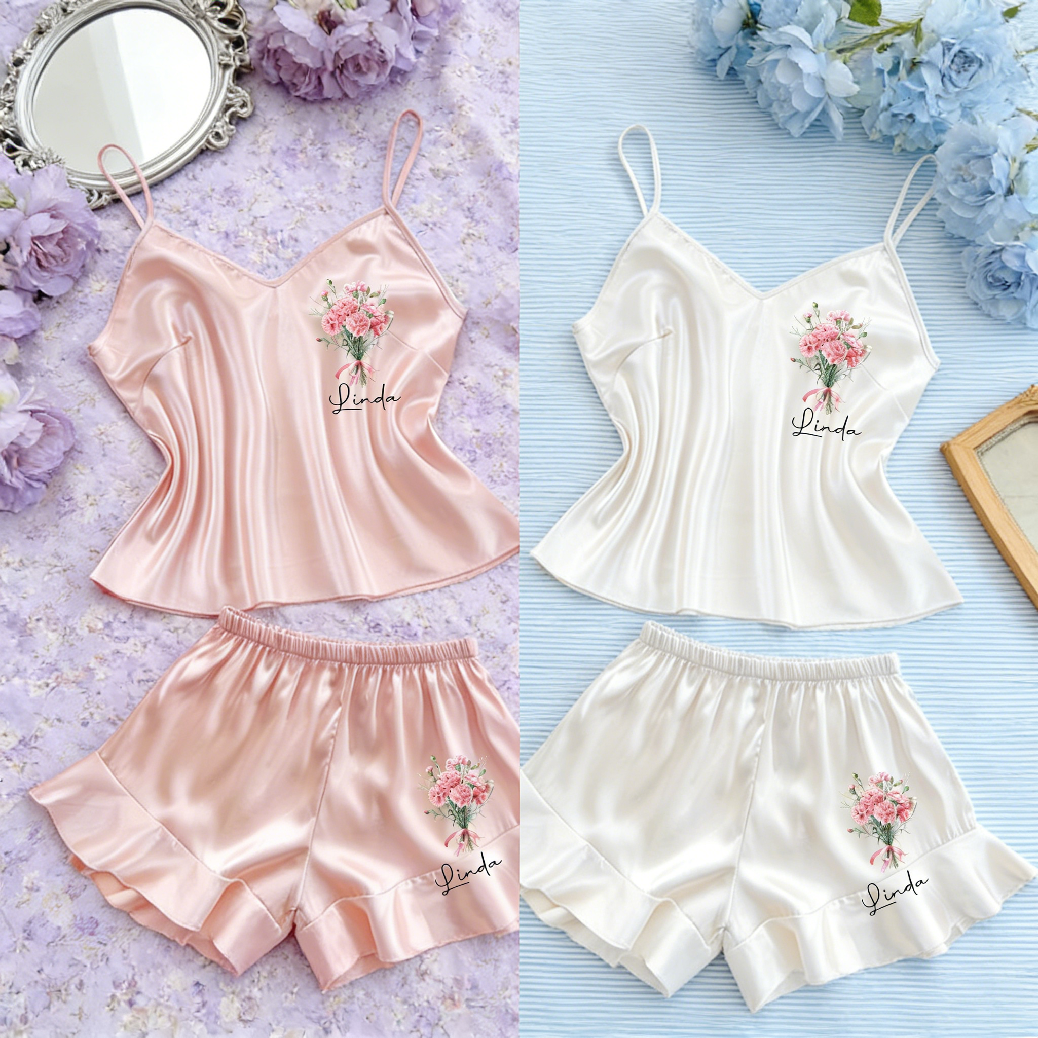 This bridesmaid pajama set is handcrafted from high-quality satin fabric, offering a soft, comfortable, lightweight, and breathable feel that ensures a restful night's sleep. We will print your name or title directly onto the camisole top. It makes for the perfect gift for bridesmaid proposals, bridal parties, bachelorette celebrations, honeymoons, or as a personalized keepsake. It is also a stylish choice for any party occasion!