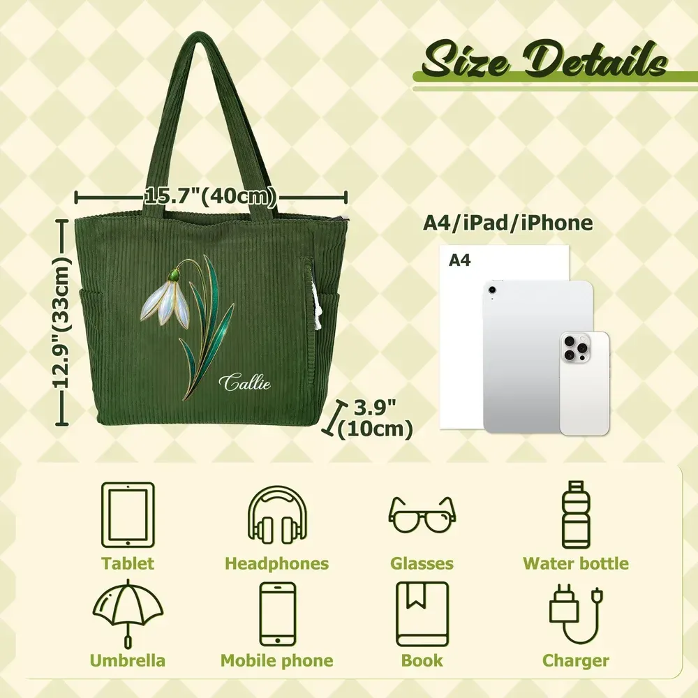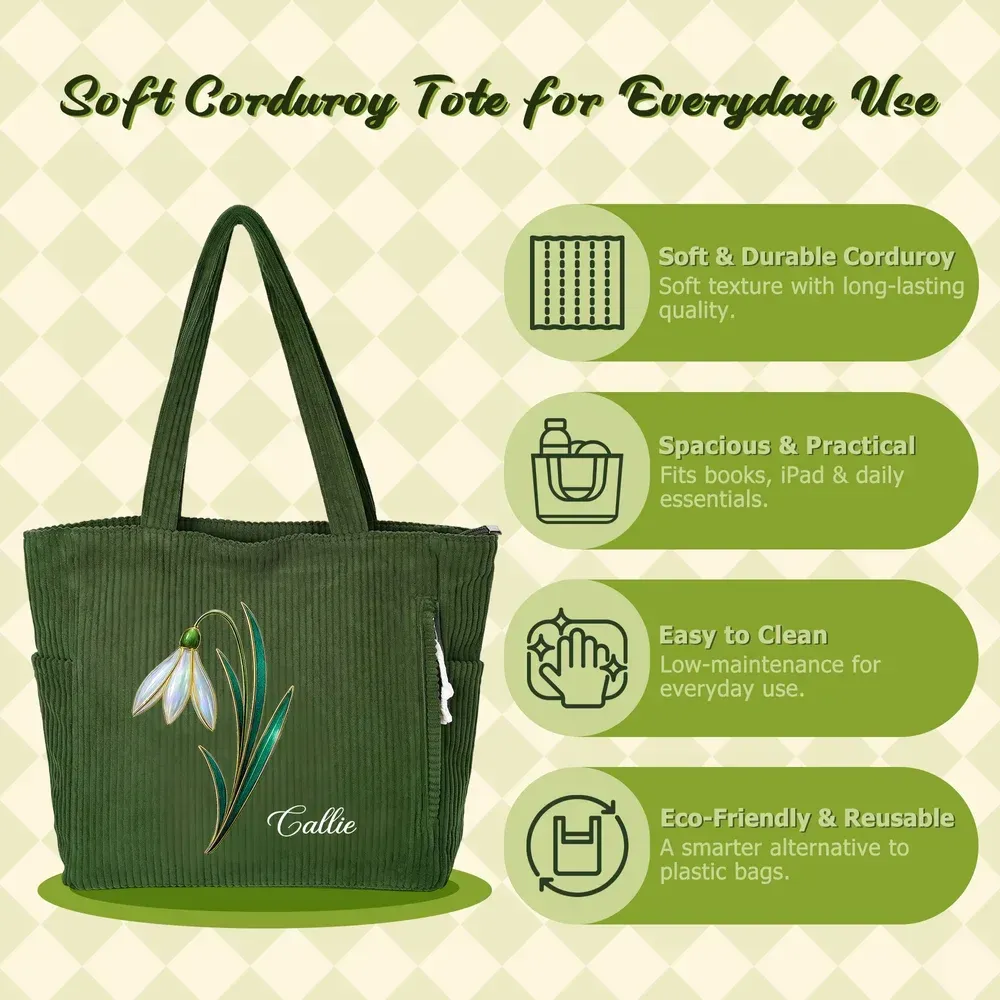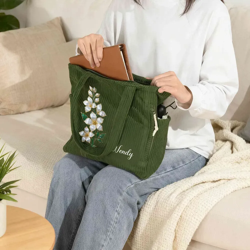 Centered around the exclusive birth flower motif, this design pairs with personalized name customization. Its gentle, elegant style exudes a sense of personal ritual, precisely aligning with feminine aesthetic preferences. The corduroy fabric naturally evokes a vintage texture, elevating the everyday commuter bag beyond monotony into a distinctive accessory that blends visual appeal with commemorative significance. High-quality corduroy fabric offers a soft, substantial feel with distinct, textured lines. Durable and resilient, it resists pilling and deformation during daily use. Suitable for all seasons, it strikes a balance between comfort and longevity. Wide shoulder straps reduce pressure, ensuring a comfortable fit without digging in, while combining practicality with ergonomic design. Core functionality tailored for daily commutes—whether navigating crowded subways, rushing buses, or driving solo—effortlessly accommodates all essentials for seamless travel. Ideal for shopping trips, weekend outings, or short getaways, its spacious design holds all your belongings. The corduroy material and birth flower motif complement diverse styles, effortlessly blending with casual, minimalist, or vintage aesthetics. Tailored for women, it makes a thoughtful present for best friends, colleagues, or loved ones. The personalized combination of birth flowers and names satisfies individuality while conveying heartfelt sentiment. Whether gifted for birthdays, holidays, or as an everyday surprise, it becomes a cherished item blending practical value with emotional warmth.