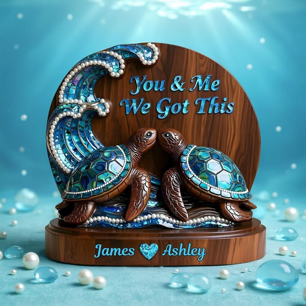 You & Me We Got This, Mother Of Pearl Styled Turtle Couple - Personalized Couple Custom Shaped Wood Plaque