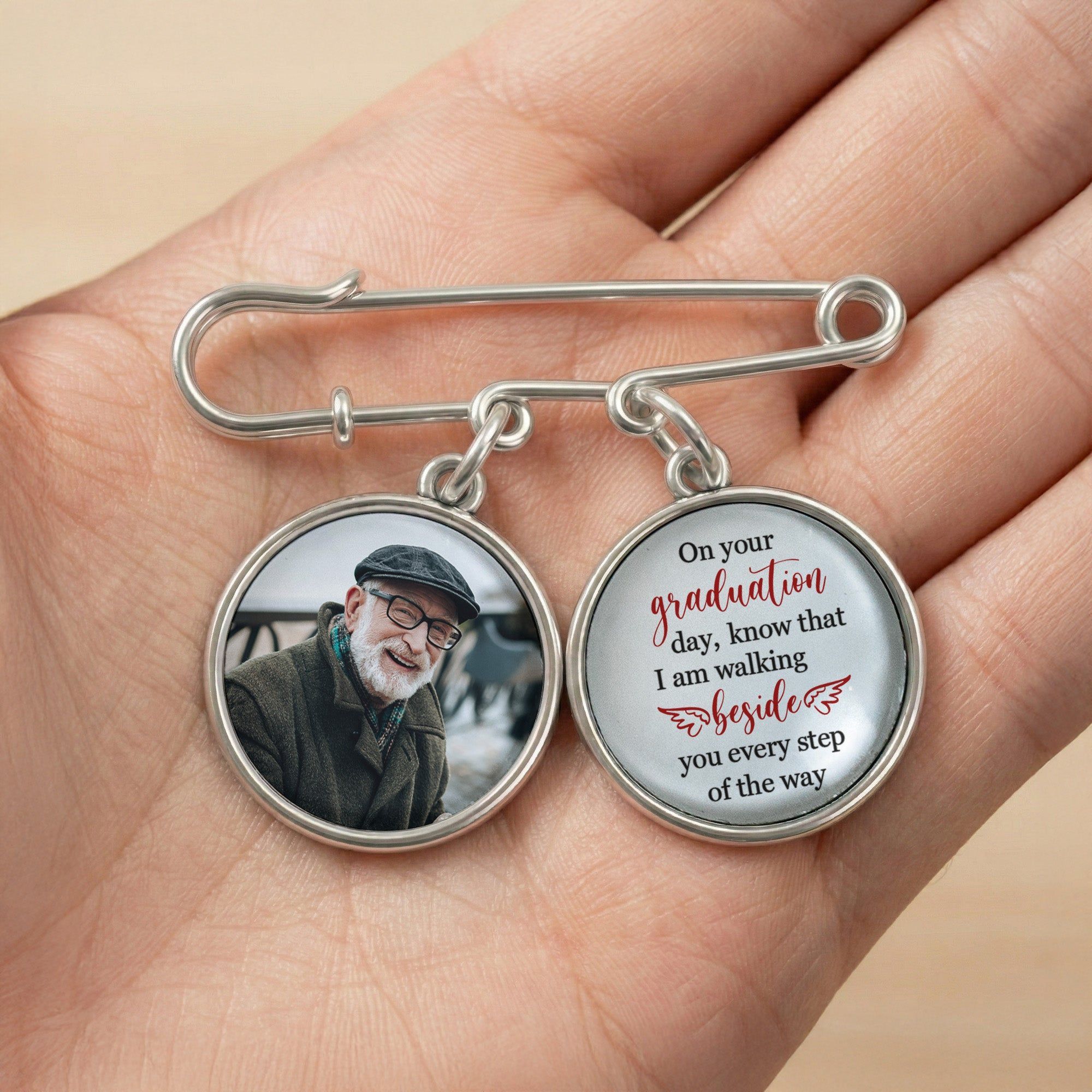 Introducing our perfect keepsake: the Graduation Walking Beside You Every Step lapel pin. It's not just an accessory; it encapsulates a tangible piece of memory. This personalized lapel pin comes with photo charms that tell a tale of unforgettable moments and shared sentiments. The lapel pin makes a beautiful memento to own, cherishing the day of proud achievement during graduation. The product captures the sense of togetherness, a constant reminder that the graduate is never alone in their journey.