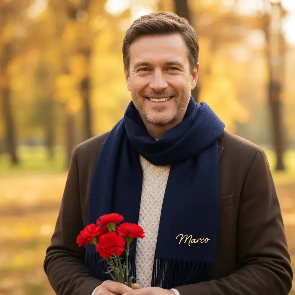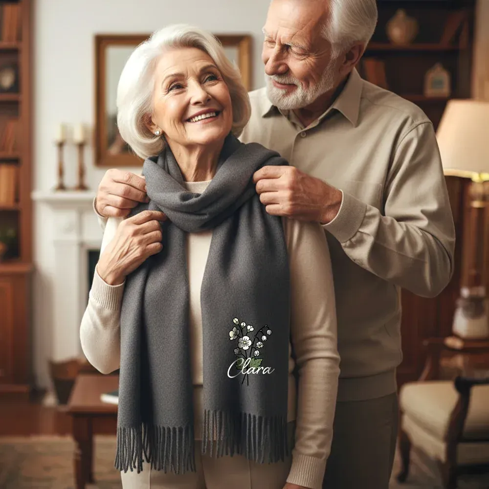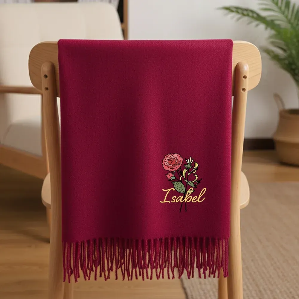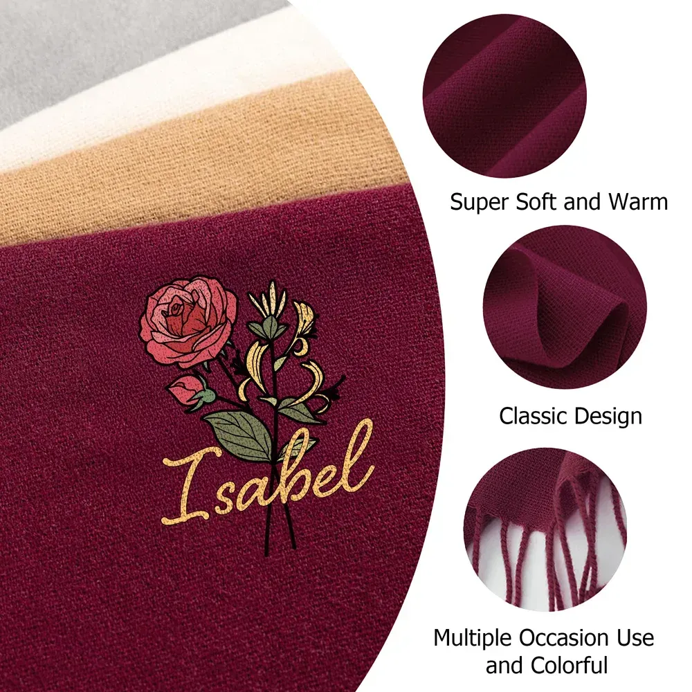 Personalised Multicolour Birth Flower Bouquet Faux Cashmere Scarf Tassel Shawl with Name Winter Accessory Birthday Holiday Gift for Family Friend