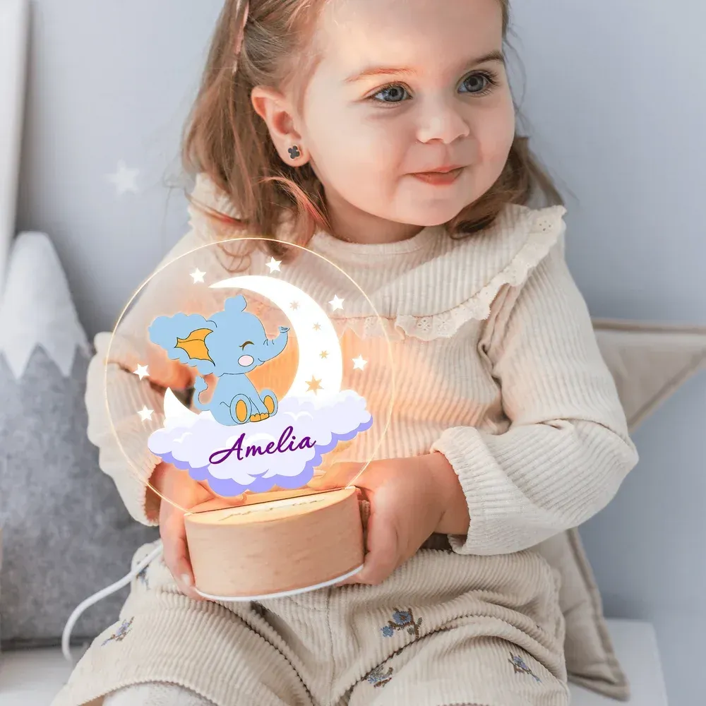 Personalized Dreamy Moon Forest Animal LED Night Light with Name Text and Wooden Base Nursery Room Decor Birthday Baby Shower Gift for Baby Kid