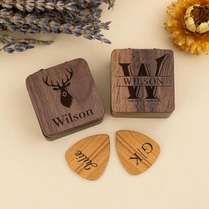 Personalized Wooden Guitar Picks with Case, Custom Guitar Pick Holder, Plectrum Box Guitar Player Gift, Father's Day